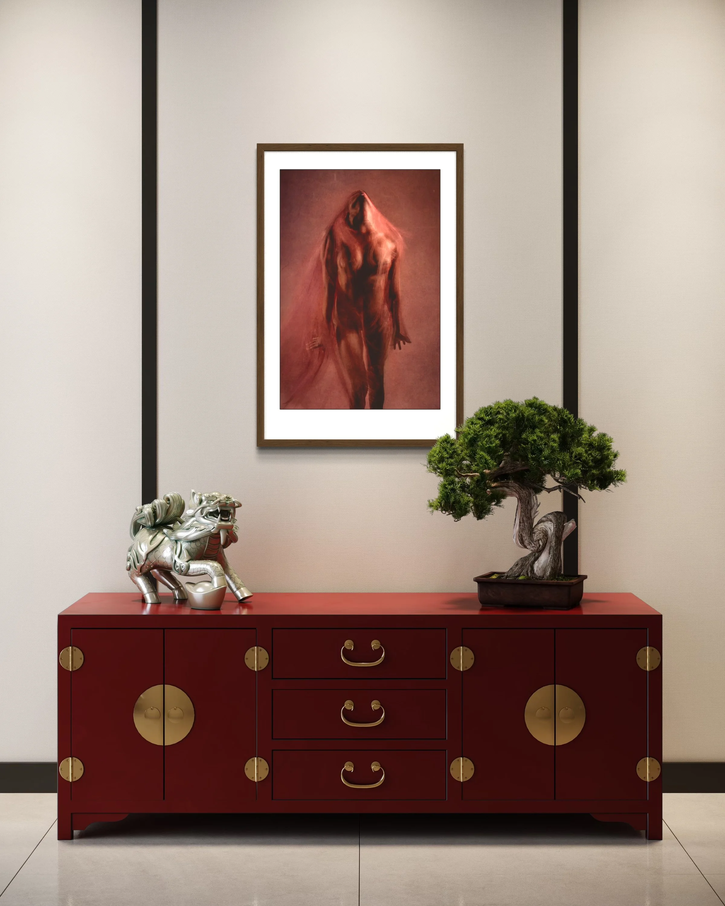 She emerges veiled and burning — not hidden, but hallowed. In Ritual of Becoming, the body is both altar and offering, suspended between flesh and spirit. Her form shimmers with reverence, dissolving into something older than language: a presence touched by fire, sanctified in motion.